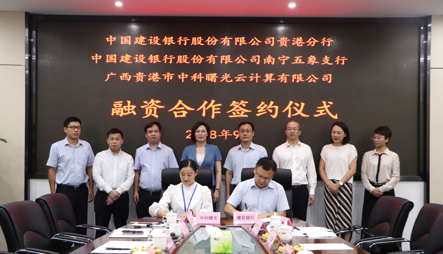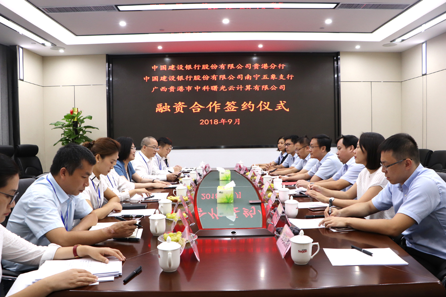 2018年(nián)9月(yuè)19日下(xià)午,廣西(xī)貴港市(shì)中科曙光(guāng)雲計算(suàn)有限公司(以下(xià)簡稱貴港中科曙光(guāng))與中國(guó)建設銀(yín)行股份有限公司貴港支行、南(nán)甯五象支行(以下(xià)簡稱建設銀(yín)行)融資合作簽約儀式在貴港中科曙光(guāng)舉行。建設銀(yín)行貴港分行杜勇行長(cháng)一(yī)行8人參加,廣西(xī)中科曙光(guāng)張愛萍董事(shì)長(cháng)熱情接待并出席簽約儀式。