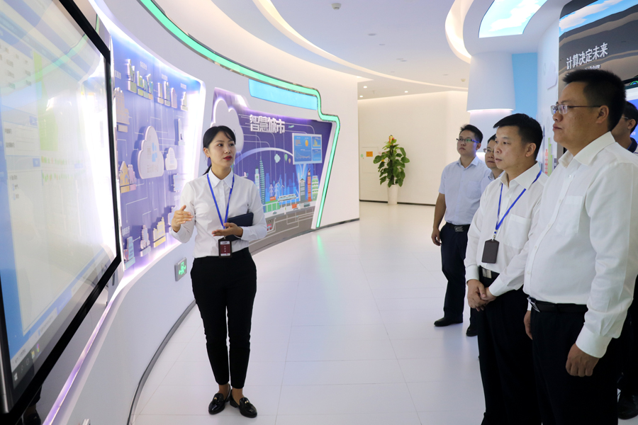 2018年(nián)9月(yuè)29日,貴港市(shì)覃塘區常務副區長(cháng)文曉華攜智慧覃塘項目牽頭單位代表到(dào)貴港智慧城(chéng)市(shì)管理中心調研。廣西(xī)貴港中科曙光(guāng)總經理吳滄海陪同參觀,并進行座談交流。