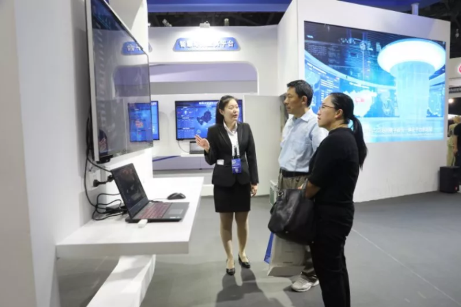 内蒙古小未雲計算有限公司講解員(yuán)在展台向來訪觀衆介紹貴港市(shì)智慧城(chéng)市(shì)建設情況