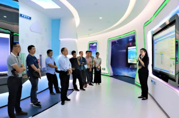 廣西(xī)貴港市(shì)中科曙光(guāng)講解員(yuán)向參觀學習一(yī)行介紹智慧市(shì)政