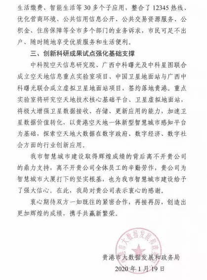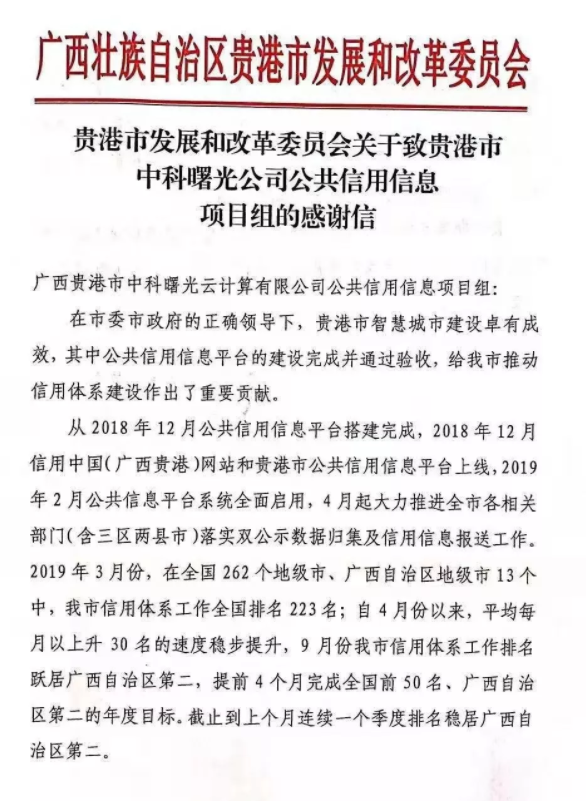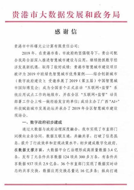 貴港市(shì)大數據發展和政務局發來的感謝信: