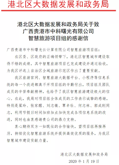 港北(běi)區大數據發展和政務局發來的感謝信: