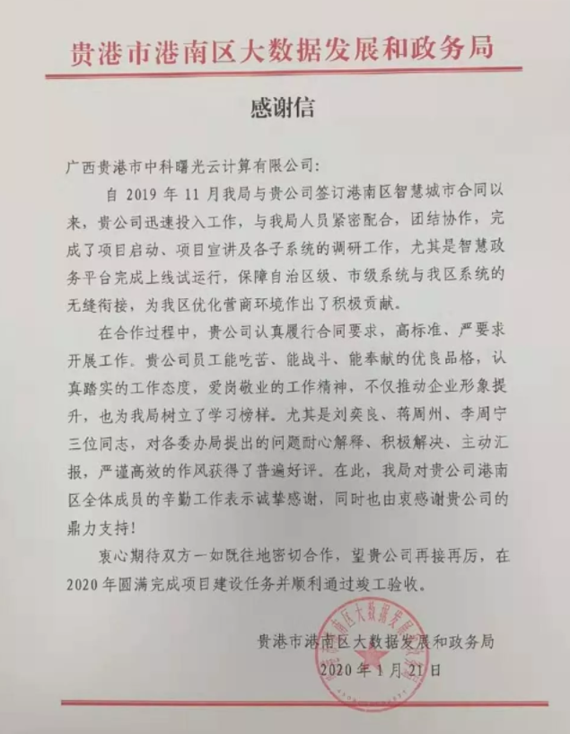 港南(nán)區大數據發展和政務局發來的感謝信: