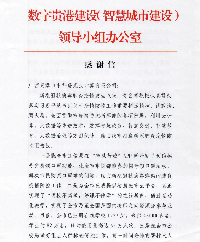繼3月(yuè)2日貴港市(shì)新型冠狀病毒感染的肺炎疫情防控工(gōng)作領導小(xiǎo)組指揮部給廣西(xī)貴港市(shì)中科曙光(guāng)雲計算(suàn)有限公司(以下(xià)簡稱“貴港中科曙光(guāng)”)發來第一(yī)封感謝函之後,近日,數字貴港建設(智慧城(chéng)市(shì)建設)領導小(xiǎo)組辦公室也發來感謝函,對貴港中科曙光(guāng)在疫情防控期間助力貴港市(shì)打赢新冠肺炎疫情防控阻擊戰表示感謝。