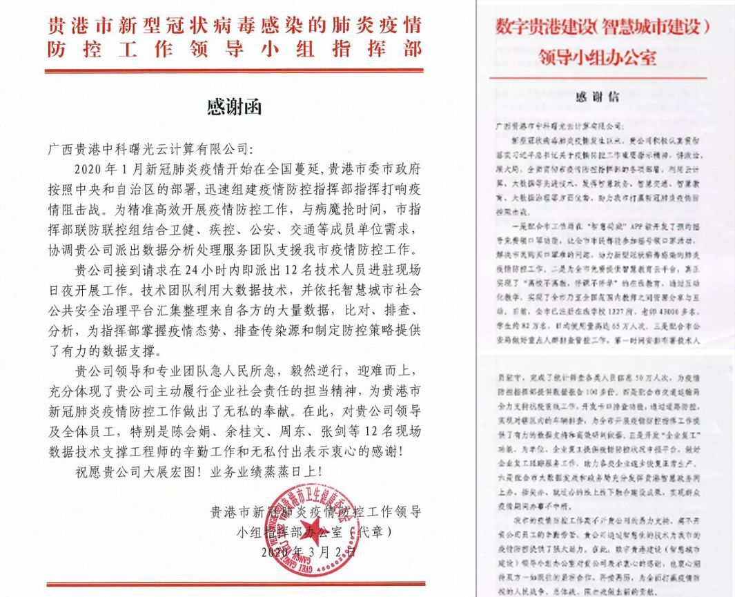 近日,廣西(xī)貴港市(shì)中科曙光(guāng)雲計算(suàn)有限公司先後收到(dào)來自(zì)貴港市(shì)新冠肺炎疫情防控工(gōng)作領導小(xiǎo)組指揮部、數字貴港建設領導小(xiǎo)組辦公室的感謝信。兩封感謝信對曙光(guāng)于疫情防控期間,快速組建專業(yè)應急團隊,以及“科技(jì)戰疫”中的各項部署給予了高(gāo)度肯定。