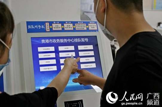 貴港市(shì)政務服務中心大廳内,辦事(shì)人員(yuán)在排隊取号。王功孝攝