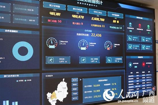 貴港市(shì)政務服務中心大廳内,智慧政務系統顯示著(zhe)各項政務辦理數據。王功孝攝