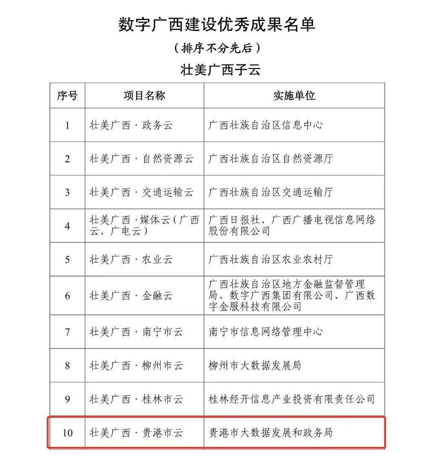 文件(jiàn)指出,自(zì)數字廣西(xī)建設大會(huì)召開(kāi)以來,全區上(shàng)下(xià)認真貫徹落實《中共廣西(xī)壯族自(zì)治區委員(yuán)會(huì)廣西(xī)壯族自(zì)治區人民(mín)政府關于深入實施大數據戰略加快數字廣西(xī)建設的意見(jiàn)》(桂發[2018]16号)等系列文件(jiàn)精神,大力開(kāi)展創新,積極發展數字經濟新業(yè)态,數字産業(yè)加快發展,産業(yè)數字化紮實推進,全區數字經濟不斷壯大,數字治理能(néng)力顯著提升。領導小(xiǎo)組對一(yī)批取得優秀成果,做出突出貢獻的項目、單位和企業(yè)進行了通(tōng)報(bào)表揚。廣西(xī)中科曙光(guāng)“壯美廣西(xī)·貴港市(shì)雲”榮獲通(tōng)報(bào)表揚。
