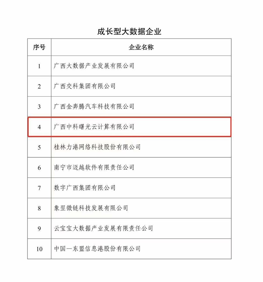 近日,自(zì)治區數字廣西(xī)領導小(xiǎo)組印發《廣西(xī)壯族自(zì)治區數字廣西(xī)建設領導小(xiǎo)組文件(jiàn)(桂數廣發[2020]7号)》,通(tōng)報(bào)表揚了一(yī)批為(wèi)數字廣西(xī)建設作出突出貢獻的項目、單位和企業(yè),廣西(xī)中科曙光(guāng)受到(dào)領導小(xiǎo)組通(tōng)報(bào)表揚。
