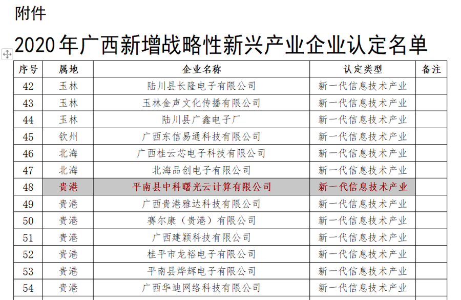 近日,自(zì)治區工(gōng)業(yè)和信息化網站(zhàn)公布了2020年(nián)廣西(xī)新增戰略性産業(yè)企業(yè)認定名單。根據《關于開(kāi)展2020年(nián)戰略性新興産業(yè)企業(yè)認定工(gōng)作的通(tōng)知》(桂新興政規〔2020〕5号)要求,經過企業(yè)申報(bào),自(zì)治區工(gōng)業(yè)和信息化廳、發展改革委審定,自(zì)治區新興産業(yè)辦核驗,平南(nán)縣中科曙光(guāng)雲計算(suàn)有限公司獲認定為(wèi)“2020年(nián)廣西(xī)新增戰略性新興産業(yè)企業(yè)”。