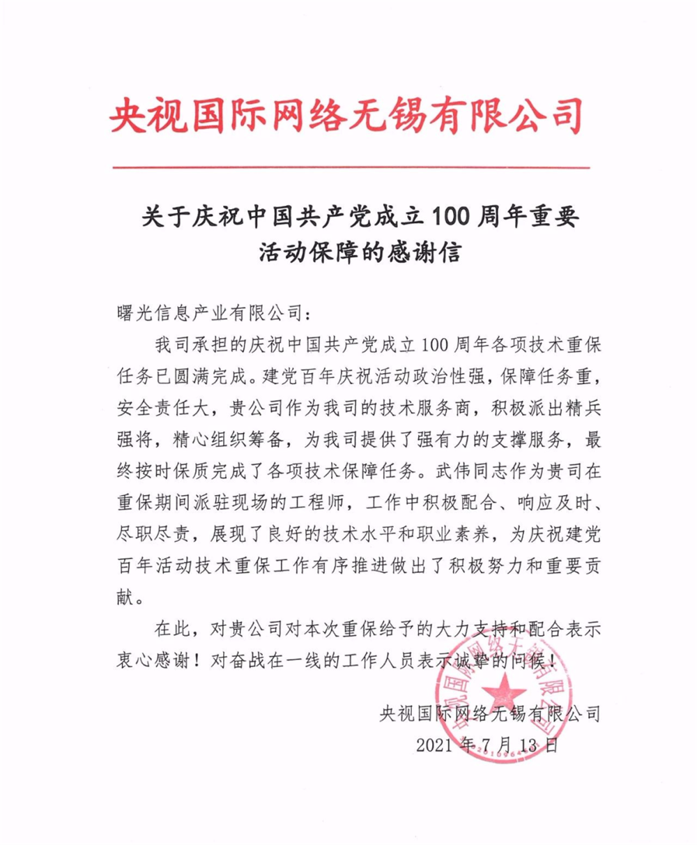 近期,中科曙光(guāng)收到(dào)來自(zì)央視國(guó)際的一(yī)封感謝信。在央視國(guó)際承擔的慶祝中國(guó)共産黨成立100周年(nián)各項技(jì)術(shù)重保任務中,曙光(guāng)作為(wèi)央視國(guó)際技(jì)術(shù)服務商,以堅實的技(jì)術(shù)力量,精心的組織籌備,為(wèi)其提供強有力的支撐服務,在保障任務十分艱巨的情況下(xià),按時保質完成了各項任務。