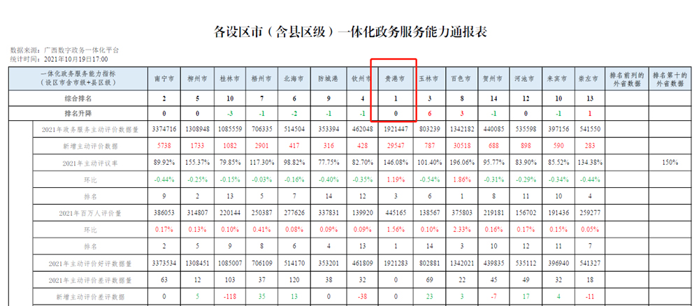 近日,廣西(xī)發布的《自(zì)治區一(yī)體化政務服務能(néng)力調查評估報(bào)告》,貴港市(shì)(含區縣)一(yī)體化政務服務能(néng)力綜合排名全區第一(yī)。